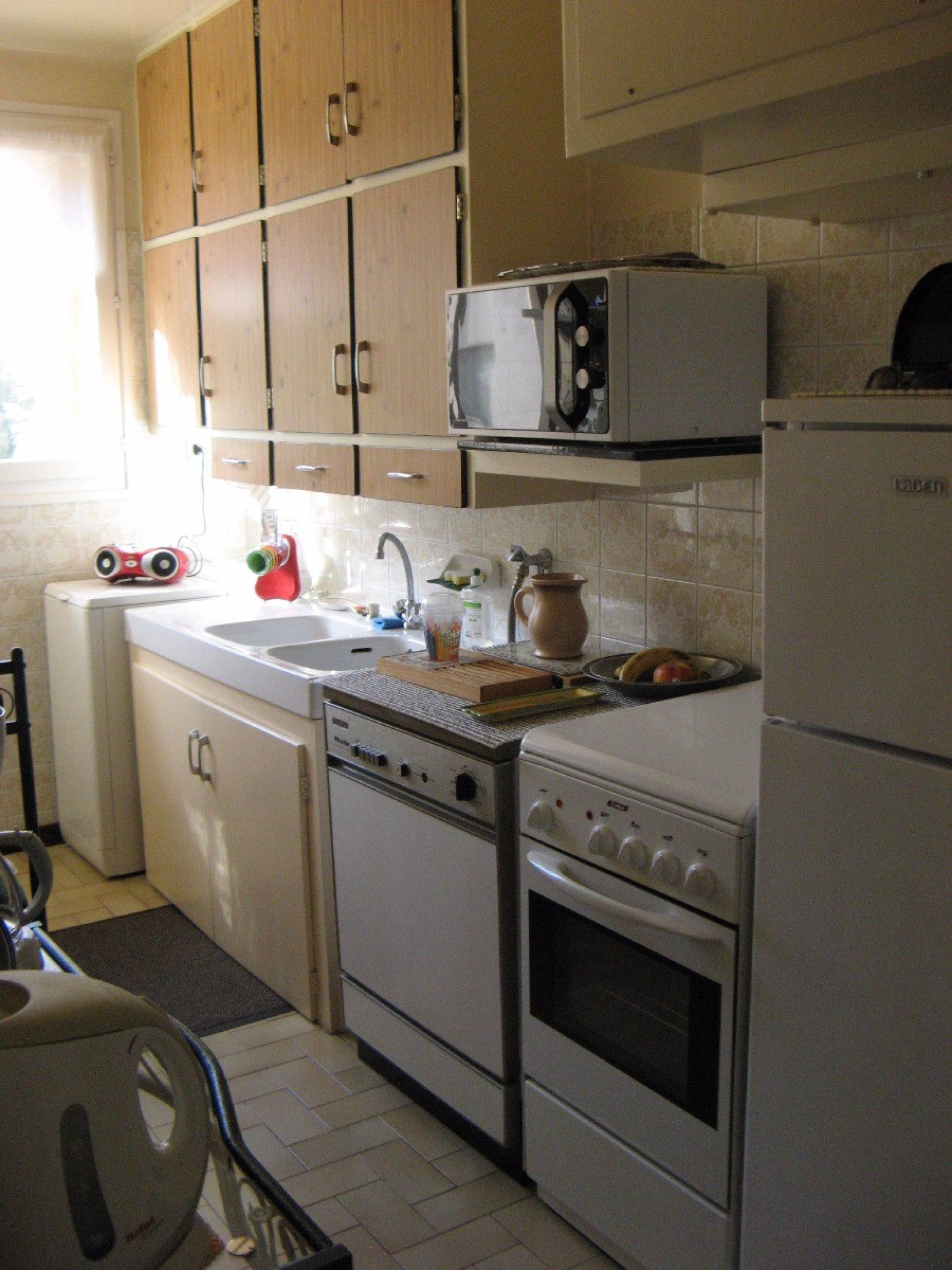-une cuisine équipée, avec vaisselle et ustensiles de cuisine, un frigidaire congélateur, four micro-ondes, four électrique, machine à laver, lave-vaisselle.
