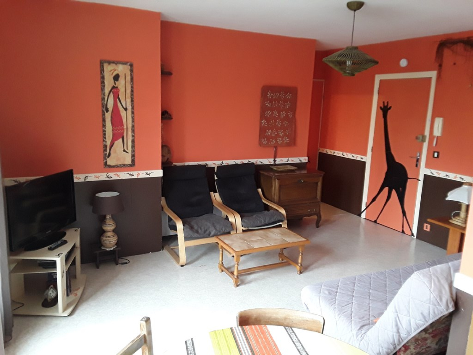 Il comprend :- une grande pièce principale avec coin cuisine, plaques électriques, frigidaire-congélateur, mini-four électrique et four micro-ondes, bac évier inox, éléments haut et bas avec vaisselle et ustensiles de cuisine, une table avec quatre chaises-un coin séjour avec meuble de rangement, un clic clac, une table basse, deux fauteuils, un meuble avec télévision couleur et télécommande écran plat,