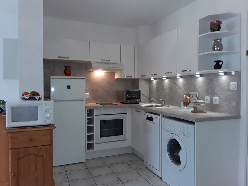 - une cuisine avec placards de rangement haut et bas, ustensiles de cuisine, un évier 2 bacs, un frigidaire-congélateur, une machine à laver, un lave vaisselle, une plaque électrique avec 4 feux, un four électrique et un micro-ondes,