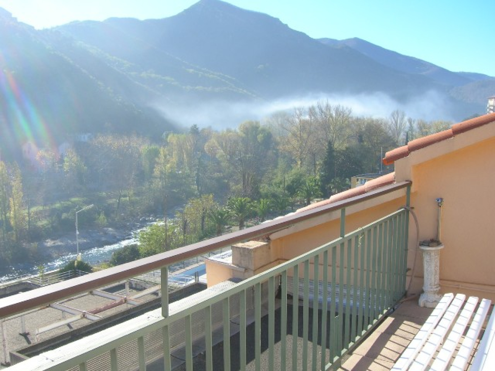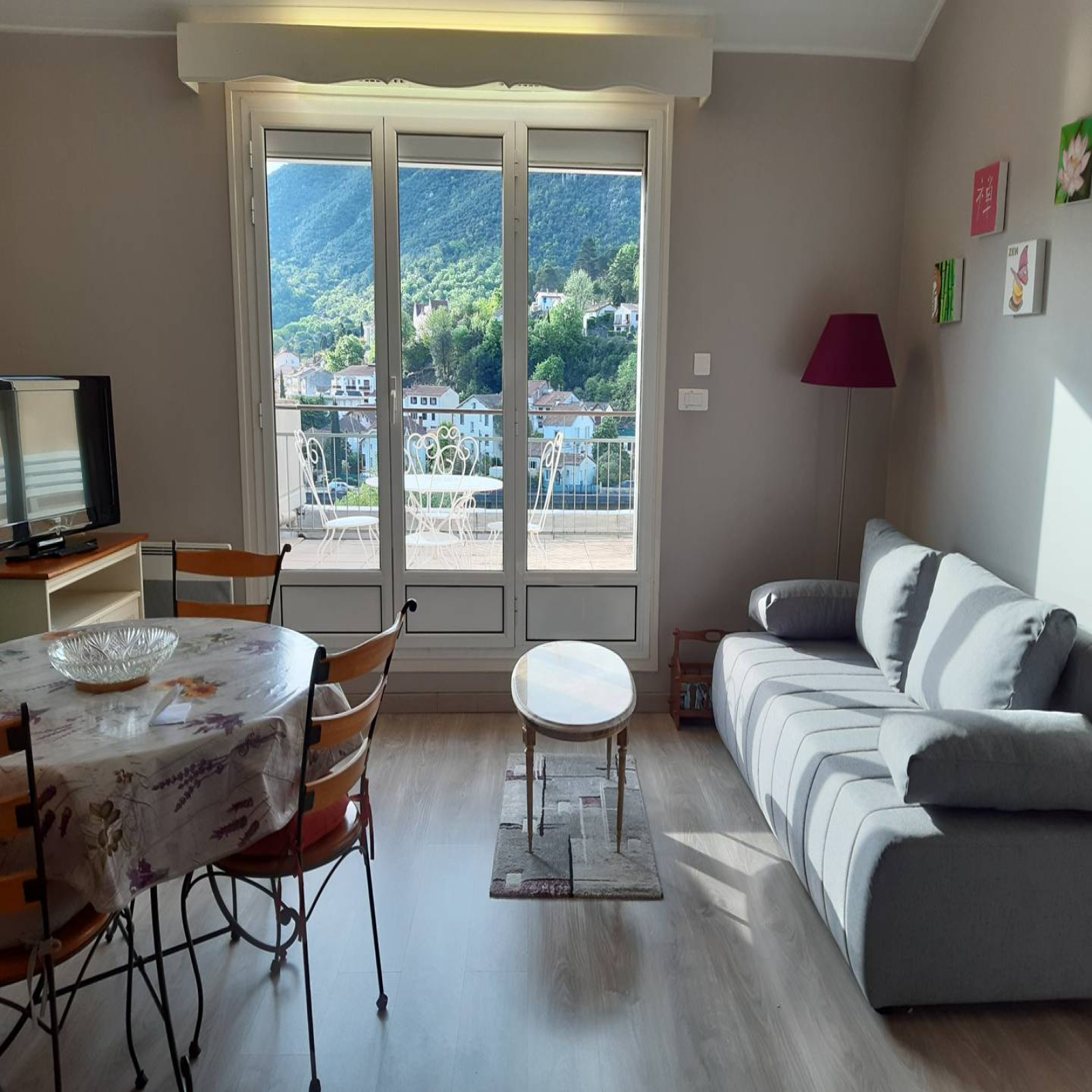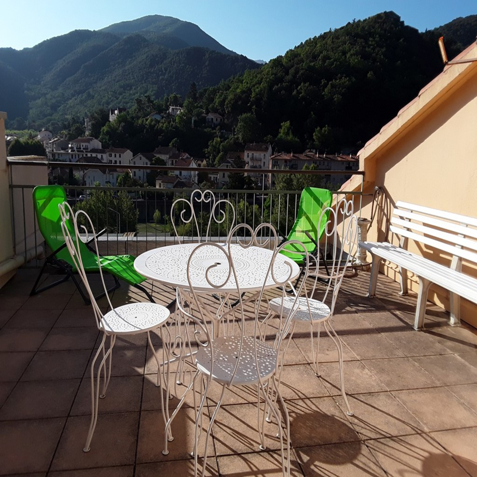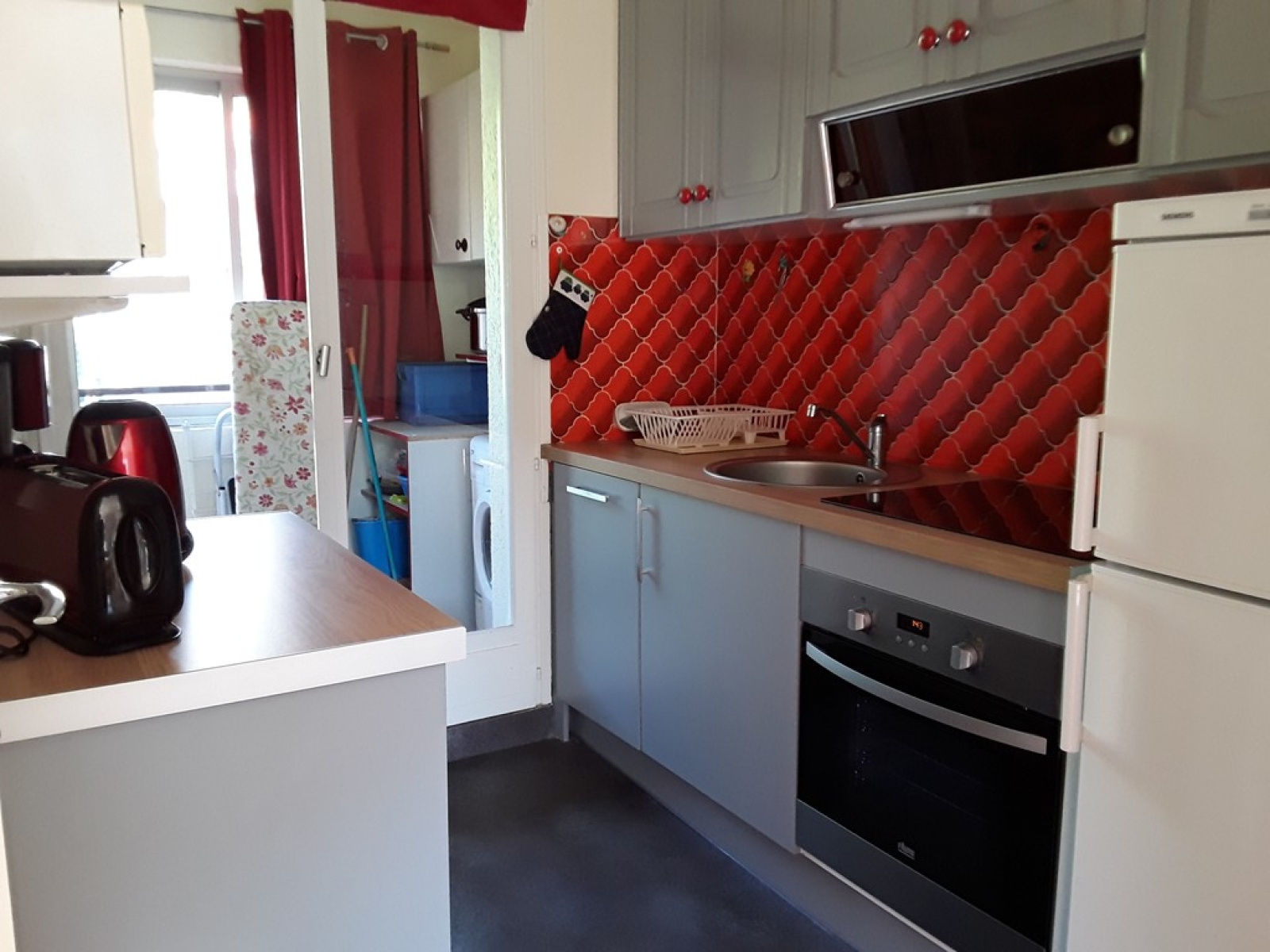 une entrée avec penderie murale, un séjour avec climatisation réversible, coin salon, donnant sur la terrasse, un clic clac, une table basse, un meuble living, une table avec 4 chaises, meuble TV et télévision, un fauteuil relax, revêtement carrelage au sol,-Une terrasse de 20 m2, avec un salon en fer forgé, un banc et un store. - Une cuisine équipée avec placards, frigidaire - congélateur, four micro-ondes, plaques vitrocéramiques, four électrique, un meuble, un évier et une loggia vitrée et fermée avec placard à balais, aspirateur traîneau, lave linge,