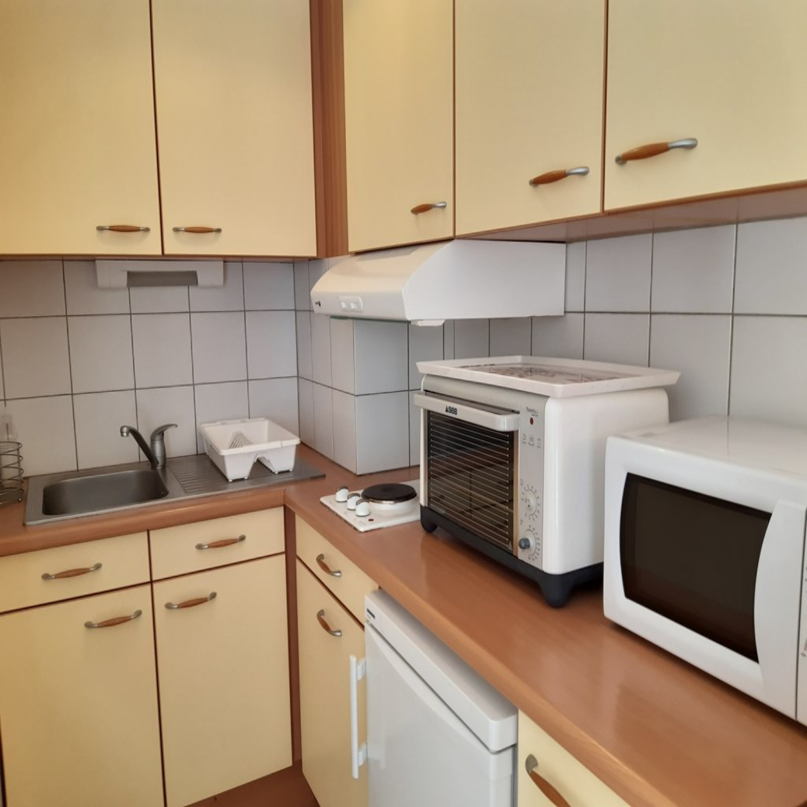 -Une kitchenette équipée, avec évier un bac, plaques électriques, hotte aspirante, un frigo top/bac congélateur, un four micro-ondes, un four électrique placards haut et bas avec vaisselle et ustensiles de cuisine.