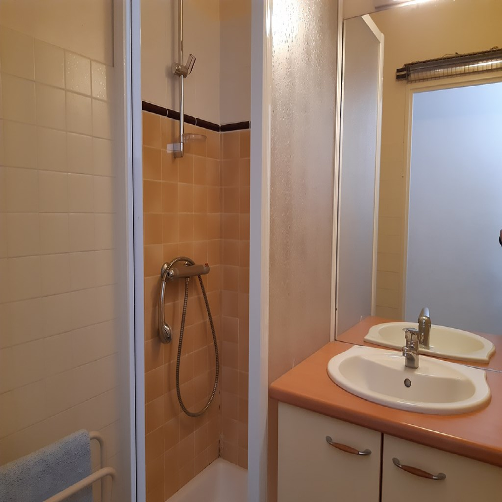 -Une salle d'eau avec cabine de douche et meuble lavabo,