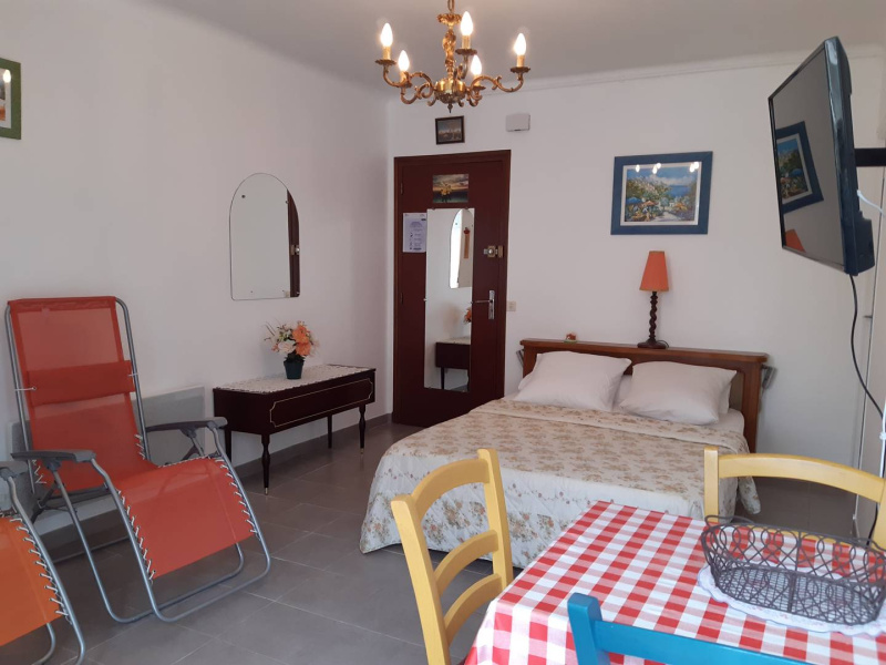 -Une pièce principale avec porte fenêtre ouvrant sur la terrasse, un lit en 140 cm avec une commode et chevet , une table avec deux chaises, deux fauteuil , une commode avec une télévision.