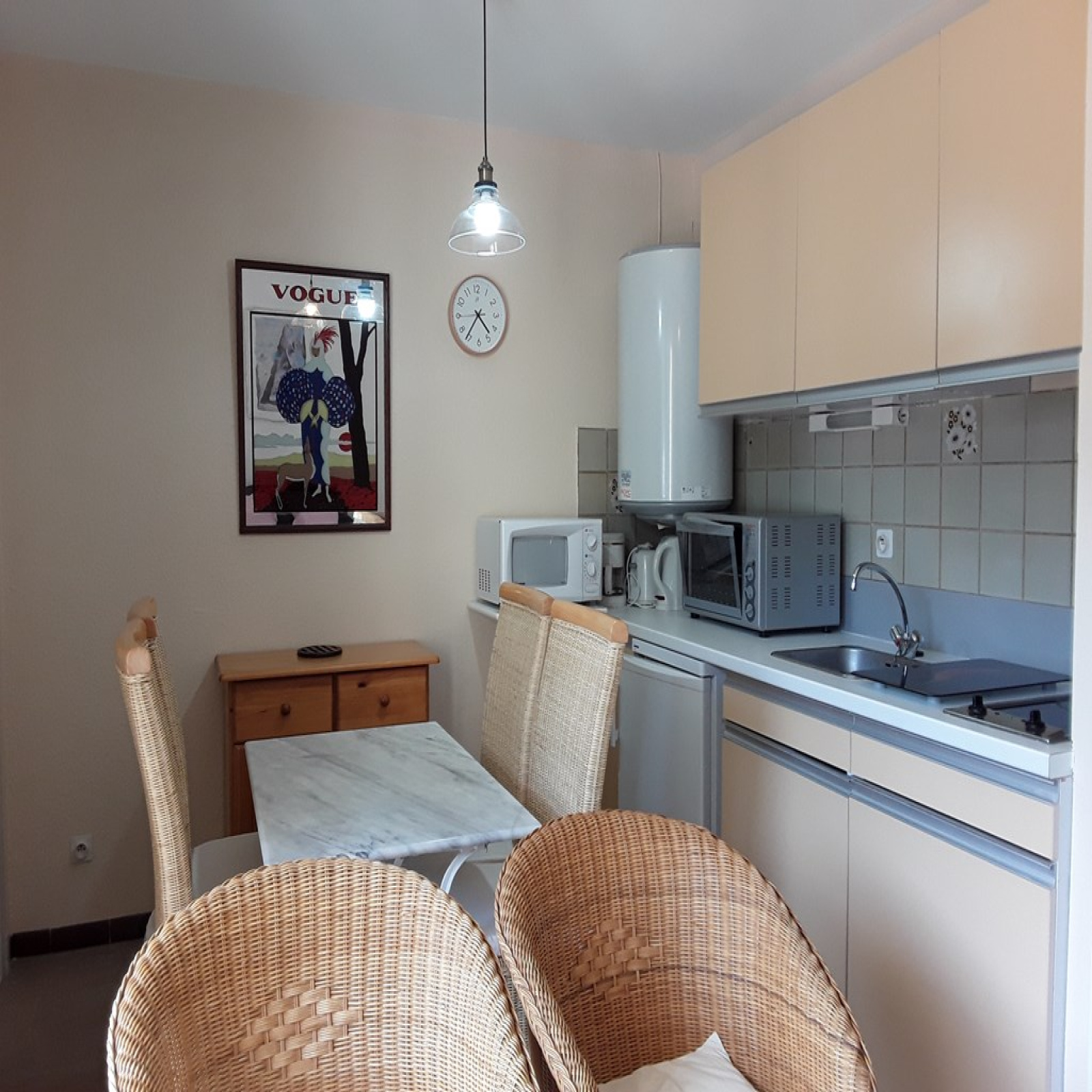 -Un coin cuisine avec plaques électriques, frigo top/congélateur, four micro-ondes, four électrique, bac évier en inox, éléments hauts et bas avec vaisselle et ustensiles de cuisine, une table avec quatre chaises