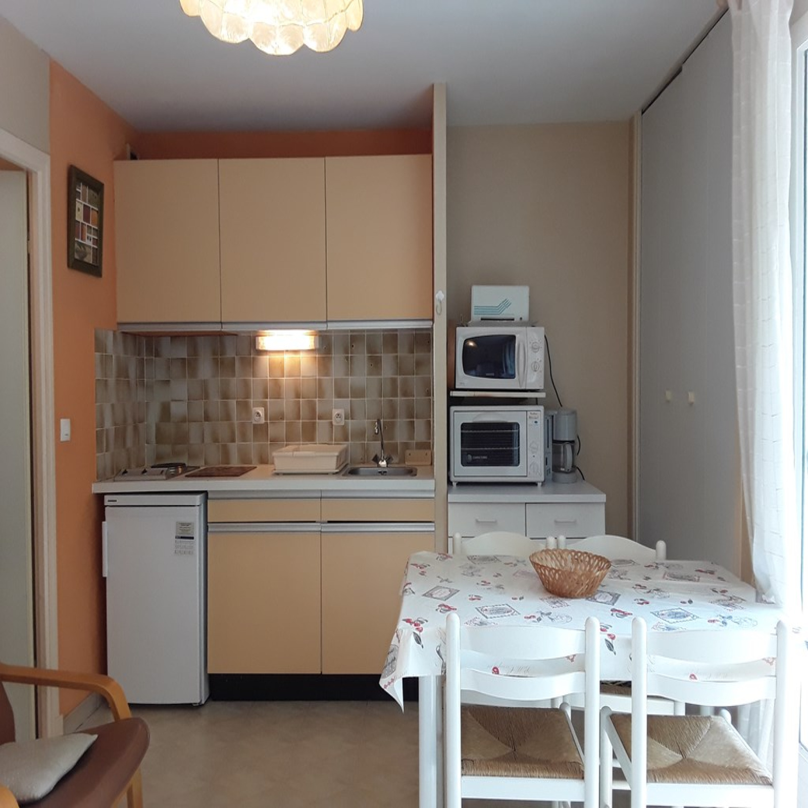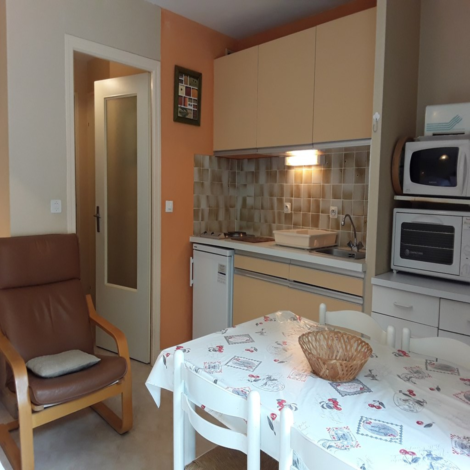 Studio d'environ 26 m², classé 2** étoiles (décision du 09/12/2021), au 6° étage avec ascenseur, donnant côté Sud avec un grand balcon. Il est à proximité de l'Etablissement Thermal et du centre ville en utilisant l'ascenseur extérieur de la rue du Parc à la rue Fort les Bains. Il comprend une pièce principale avec : coin cuisine avec plaques électriques, un four électrique, un four micro-ondes, frigotop/bac congélateur, bac évier inox, éléments hauts et bas avec vaisselle et ustensiles de cuisine, une table avec quatre chaises, deux fauteuils, un petit meuble de rangement, un coin repos avec un lit en 140 cm, une télévision, tables de chevet, une commode, un placard KZ,une salle d'eau avec cabine de douche, meuble vasque lavabo, une armoire penderie/étagère et une machine à laver le linge.WC séparé.