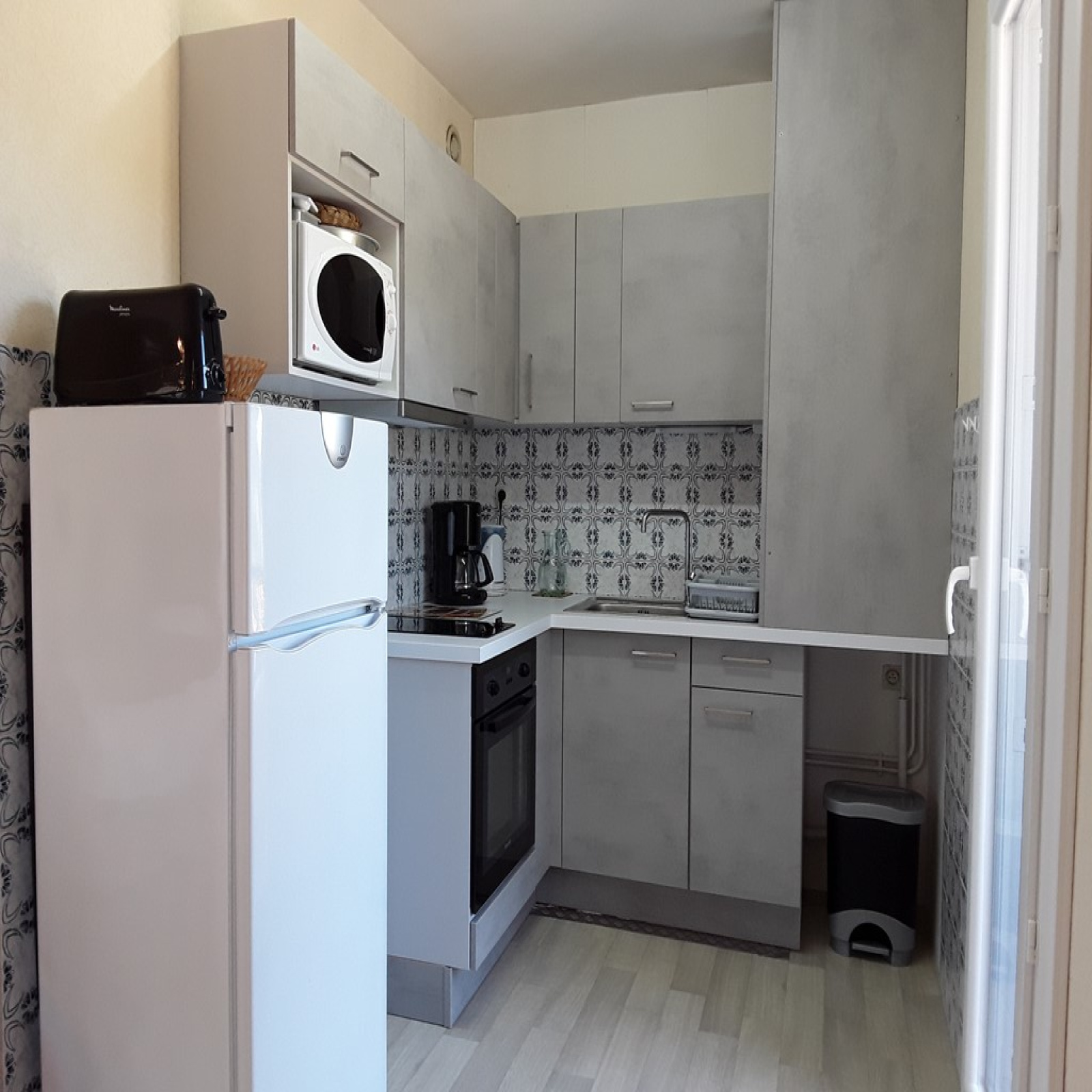 -Un coin cuisine équipée, domino vitro-céramique, four électrique, four micro-ondes, frigidaire/Congélateur, bac évier, éléments haut et bas avec vaisselle et ustensiles de cuisine