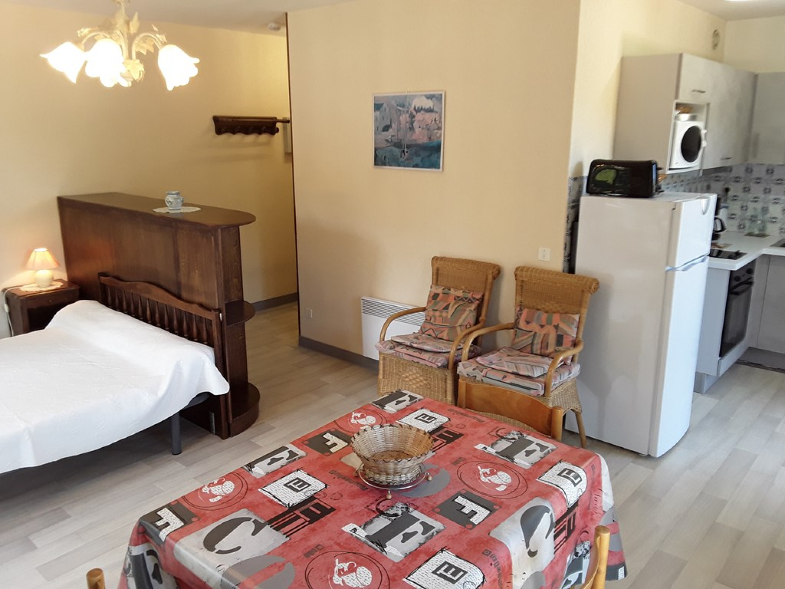 -Un coin séjour avec une table et trois chaises, deux fauteuils, un buffet, un lit en 140 cm, chevet, placard KZ, une télévision.