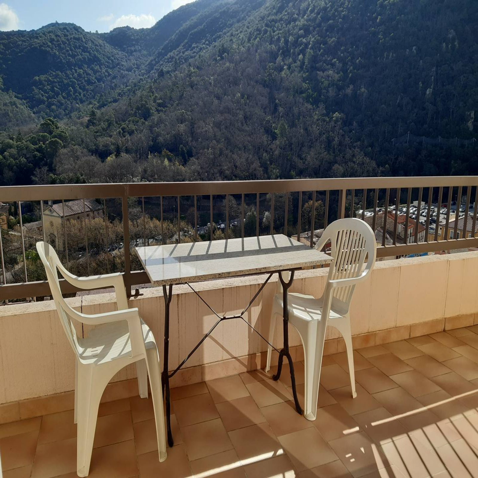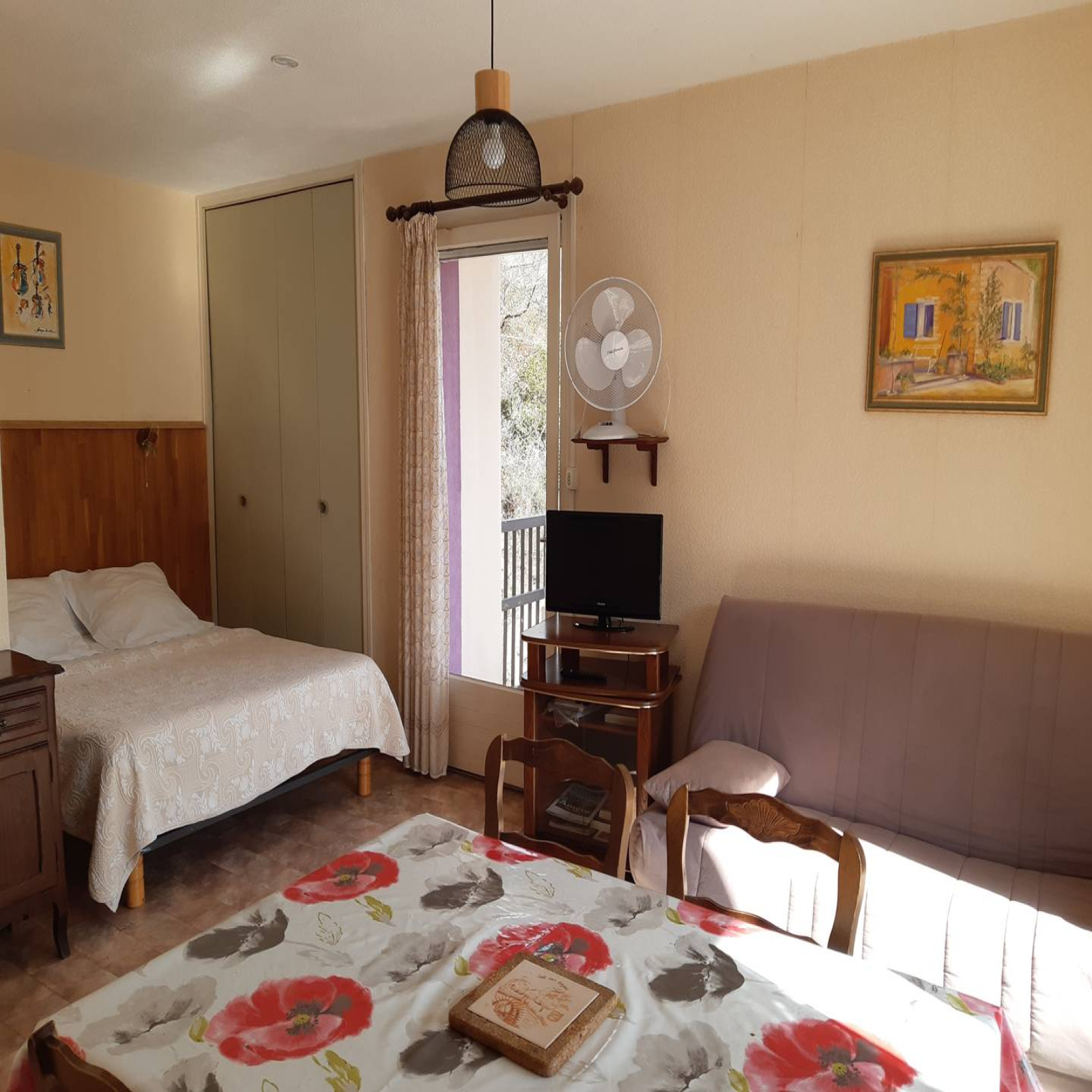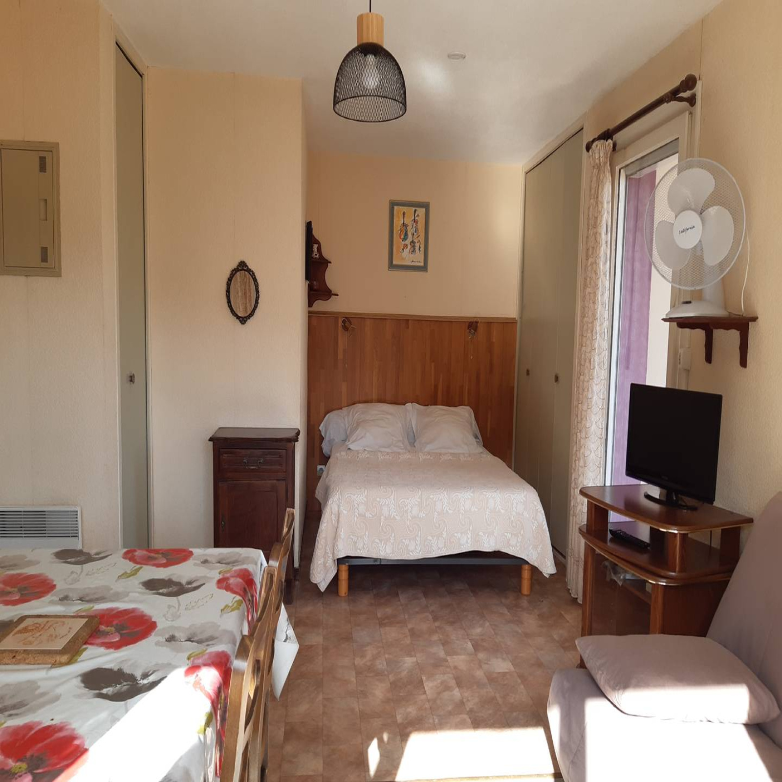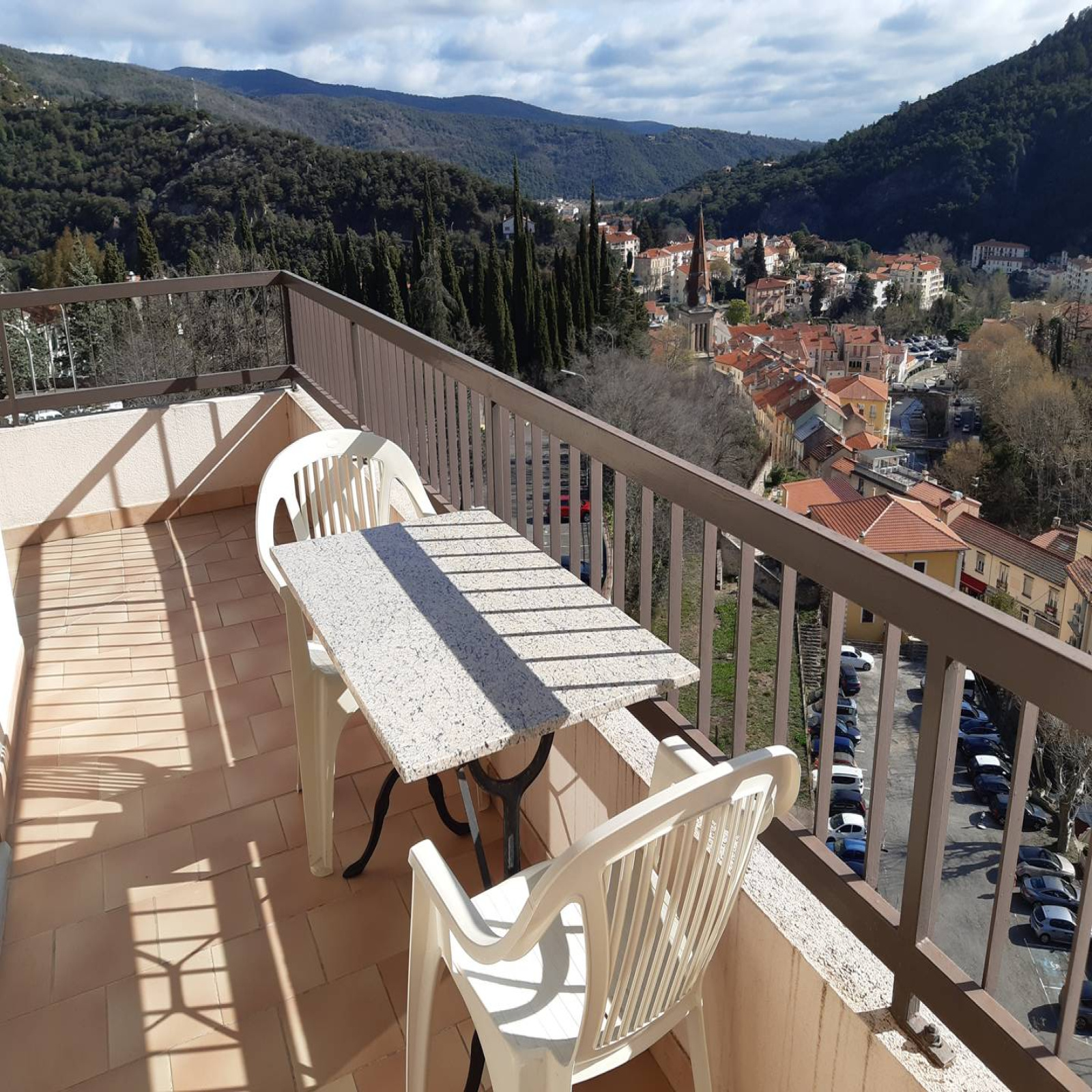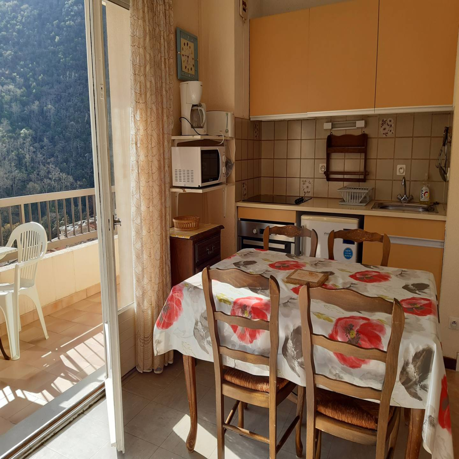 .Studio d'environ 28 m² au 3°étage avec ascenseur, donnant côté Est et Nord Est avec une grande terrasse d'angle. Il est à proximité immédiate de l'Etablissement Thermal et du centre ville en utilisant l'ascenseur extérieur de la rue du Parc à la rue Fort les Bains.Il comprend :- Un coin cuisine avec plaque vitro-céramique, four électrique, four micro-ondes, frigo/top congélateur, bac évier inox, éléments bas et hauts avec vaisselle et ustensiles de cuisine, une table avec quatre chaises,