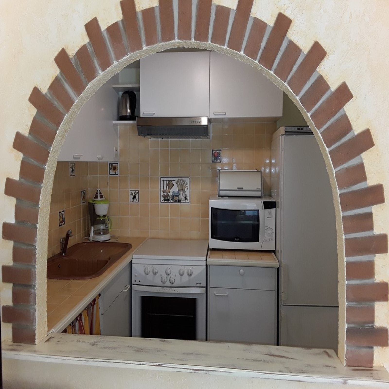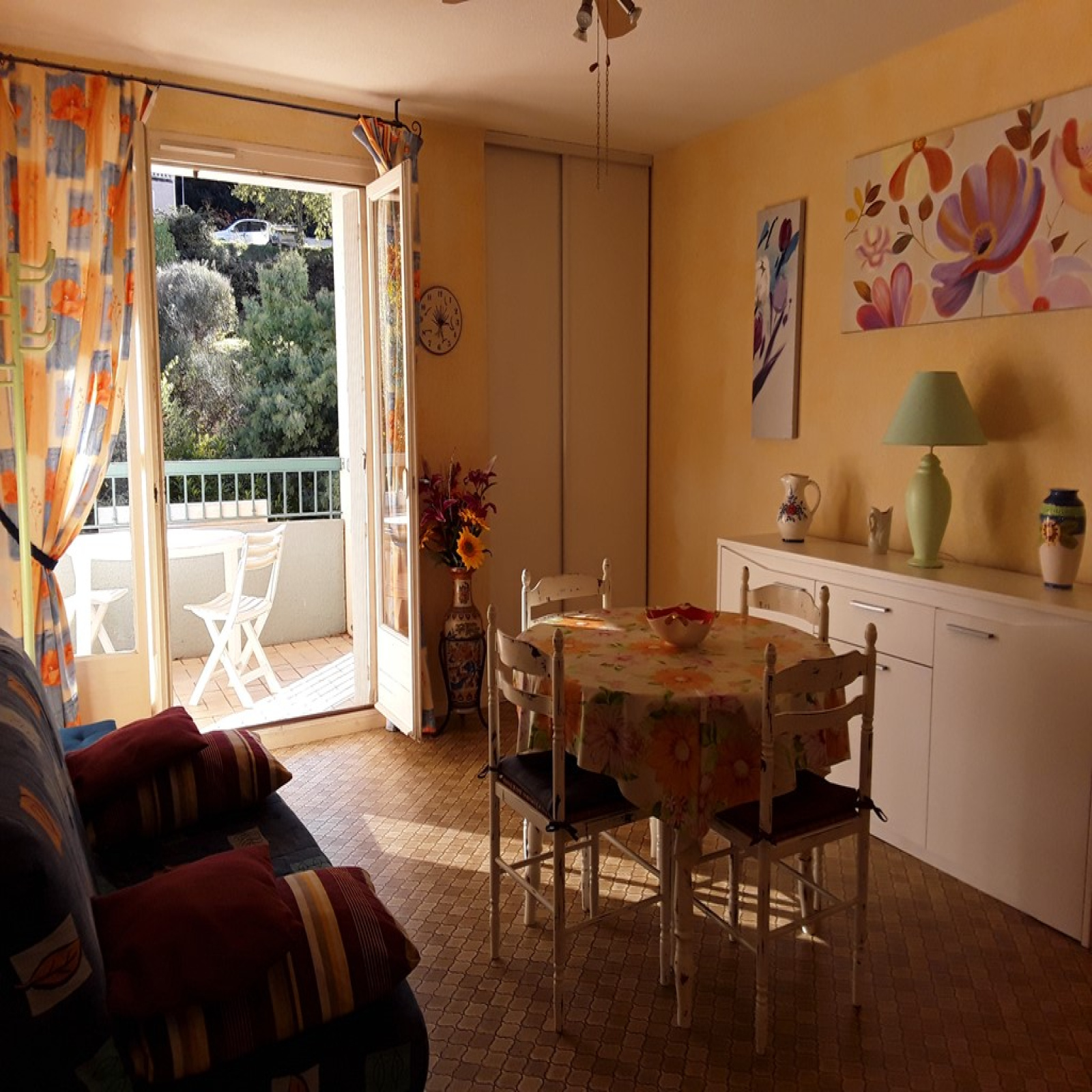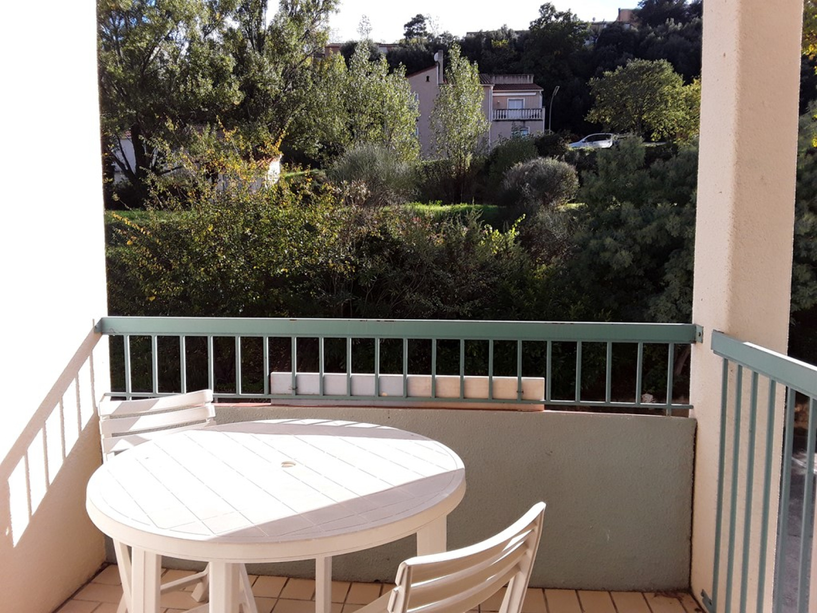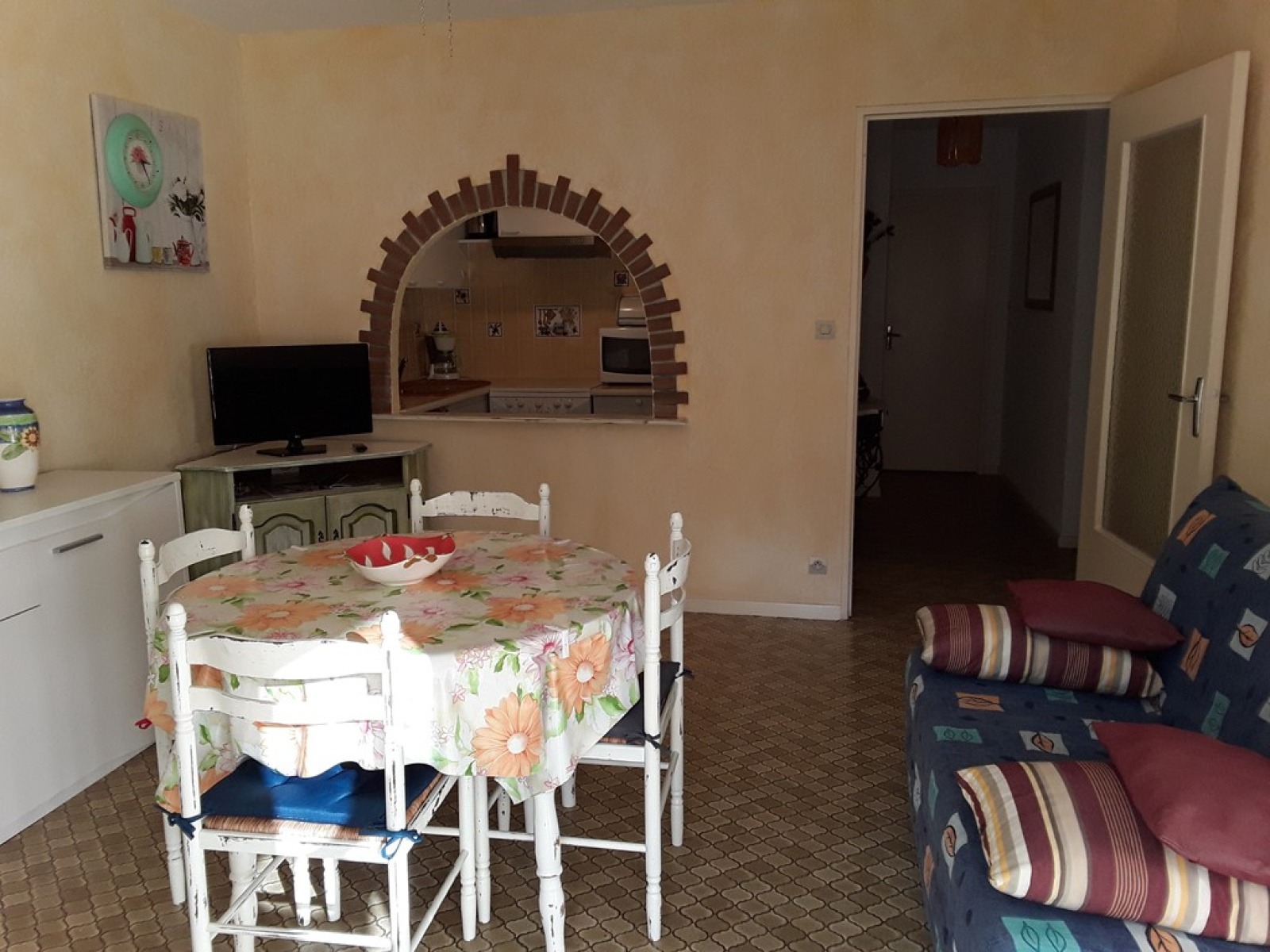Il comprend : - une entrée, une salle de séjour avec une table et quatre chaises, un buffet bas, une télévision couleur, un clic-clac, un placard kz, une porte fenêtre ouvrant sur le balcon, une cuisine séparée du séjour par un passe-plats, avec placards haut et bas, vaisselle et ustensiles de cuisine, un frigidaire-congélateur, un évier un bac, une gazinière avec 3 feux à gaz et une plaque et four électrique, un four micro-ondes. une chambre avec un lit en 140 cm, un chevet, et un placard penderie mural une salle de douche avec une douche à l’Italienne, un meuble-lavabo, un wc et une machine à laver. un balcon couvert avec une table et quatre chaises.