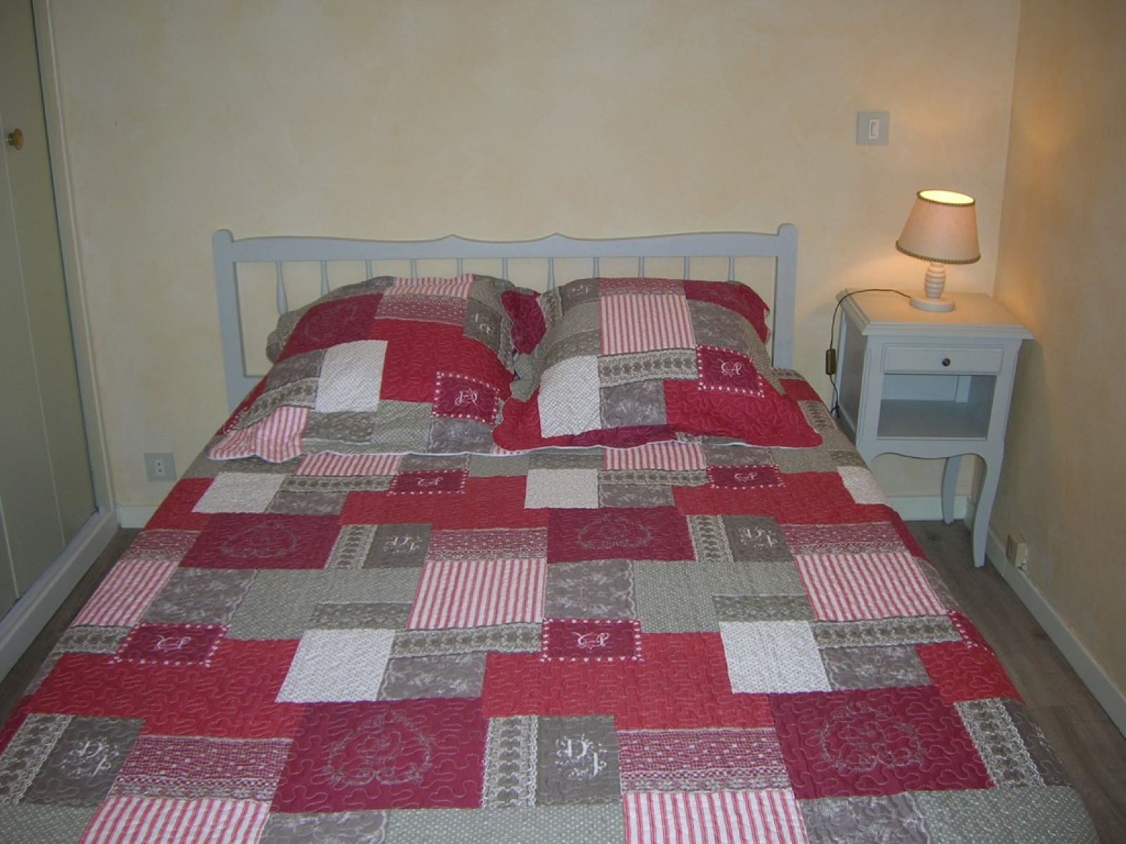 -une chambre avec un lit en 140 cm, une table de chevet avec lampe, un placard penderie, et un portant.