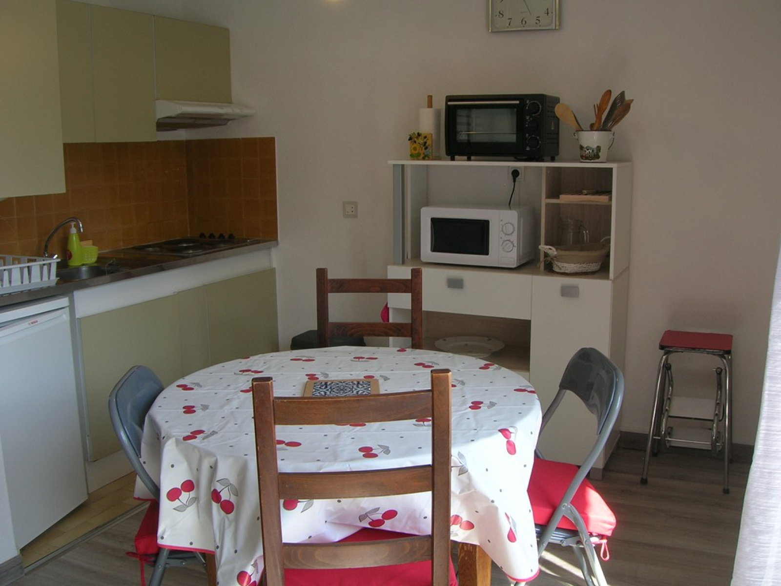 -une grande pièce principale avec un coin cuisine, plaques électriques, four électrique, micro-ondes, frigo top avec fonction congélation, bac évier en inox, éléments haut et bas, un buffet bas avec vaisselle et ustensiles de cuisine, une table avec quatre chaises, un placard KZ, coin repos avec clic clac, une commode, une télévision couleur écran plat avec télécommande