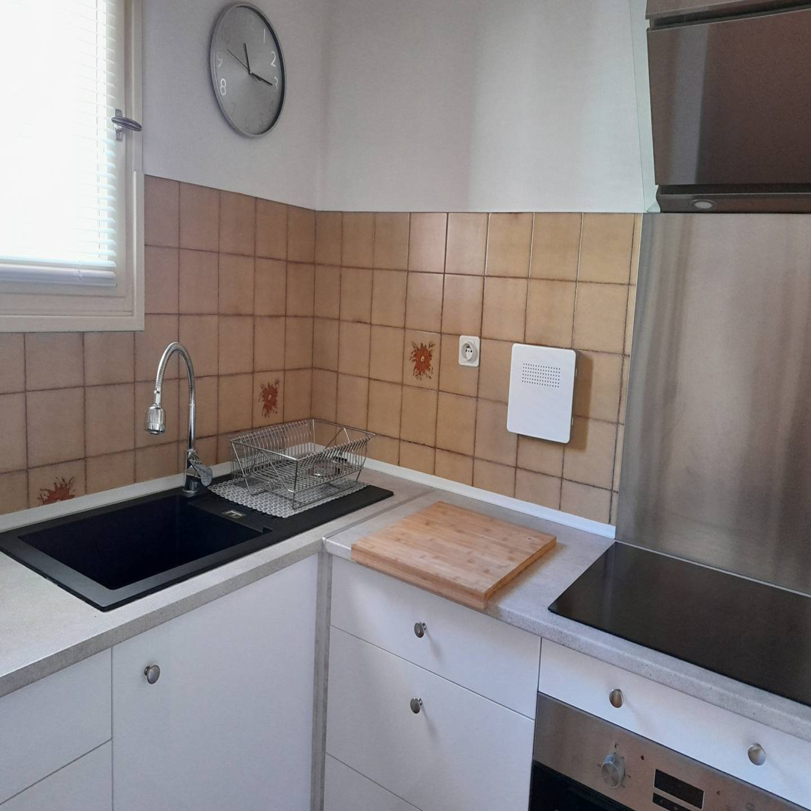 .Une cuisine avec placard, vaisselle et ustensiles de cuisine, un frigidaire/congélateur, plaque induction et hotte, un four micro-ondes et un four électrique.