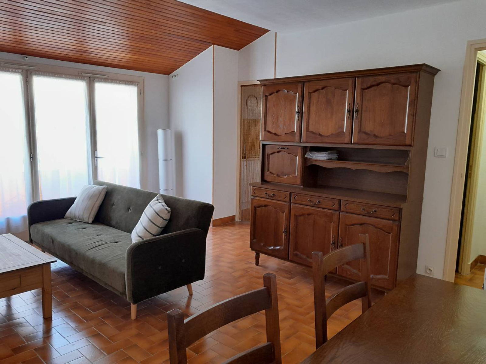 .Une salle de séjour avec une table et six chaises, un buffet, une télévision couleur, un canapé convertible, une porte fenêtre ouvrant sur le balcon.