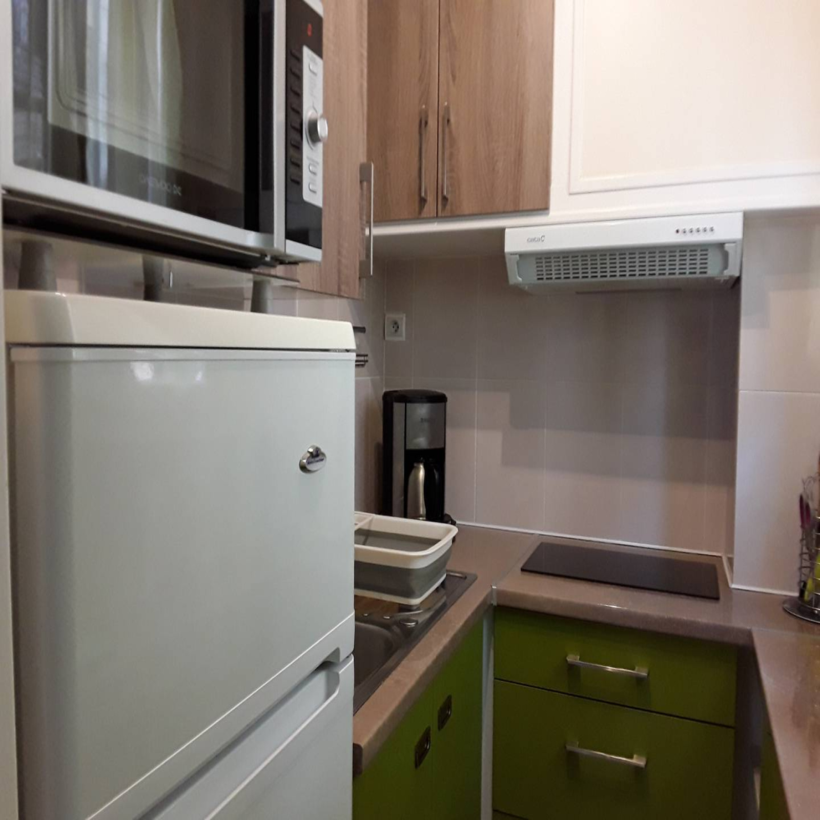 - Un coin cuisine, avec plaque vitro-céramique, frigidaire-congélateur, four micro ondes grill, éléments bas et haut avec vaisselle et ustensiles de cuisine.