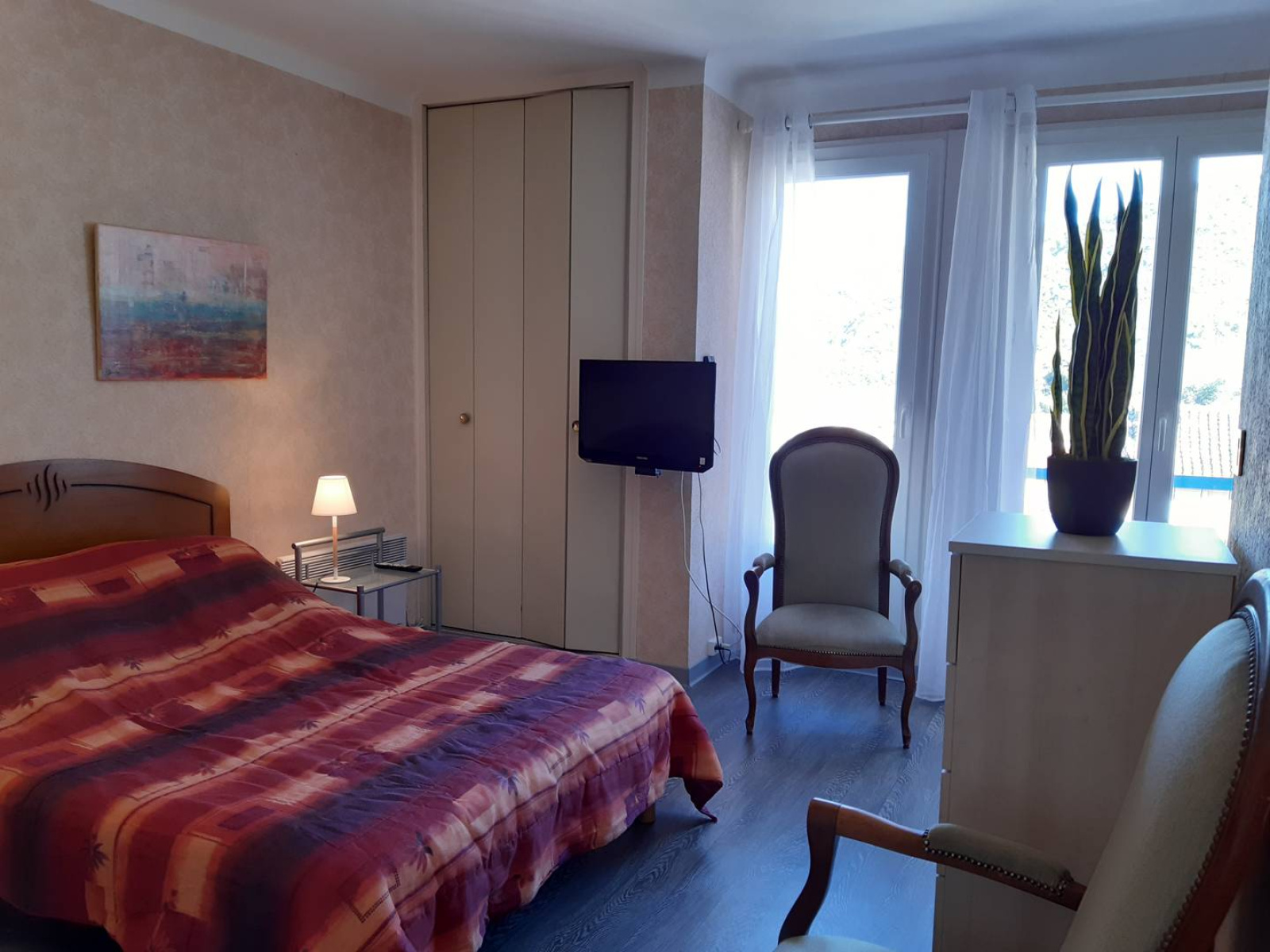 -Coin séjour et nuit avec une literie en 140 cm, deux fauteuils, un meuble penderie et étagère, un placard KZ.