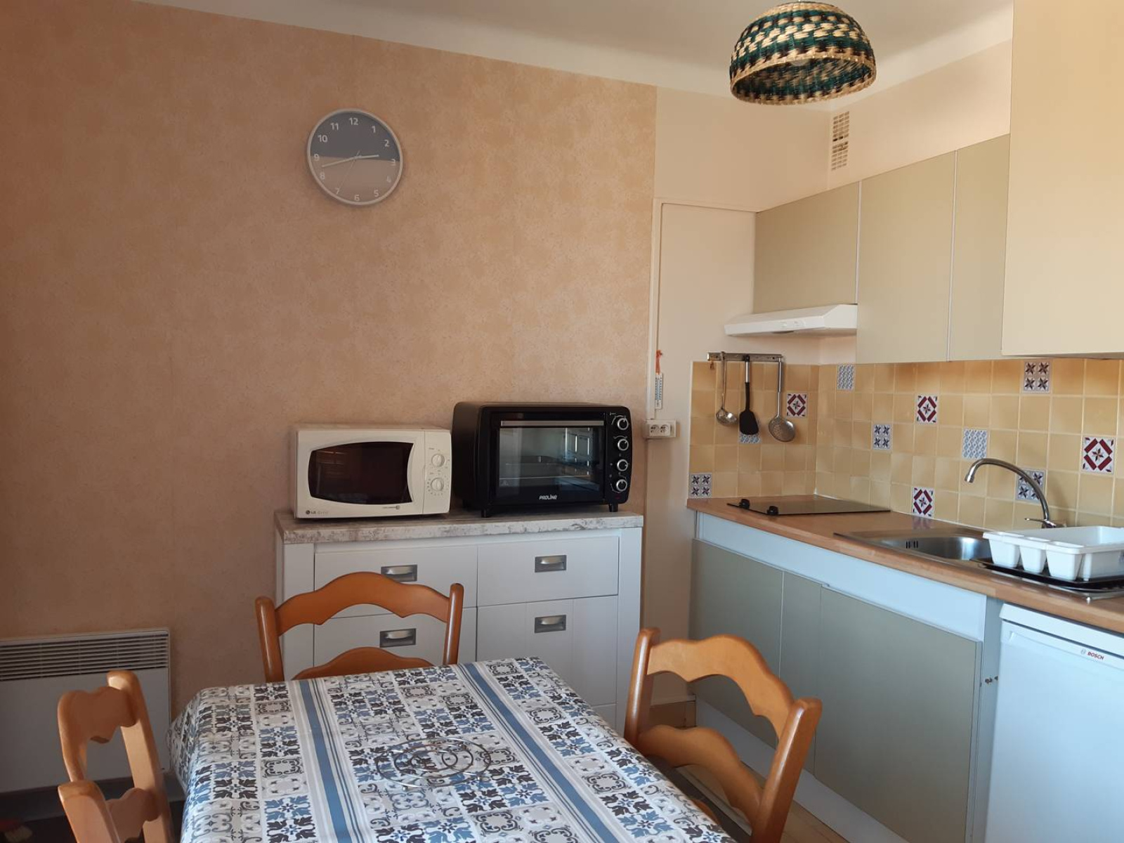 -Coin cuisine avec Plaque cuisson vitro-céramique, frigo top/bac congélateur, four électrique et four micro-ondes , bac évier en inox, un buffet, une table avec quatre chaises, une télévision avec bras articulé et support mural.