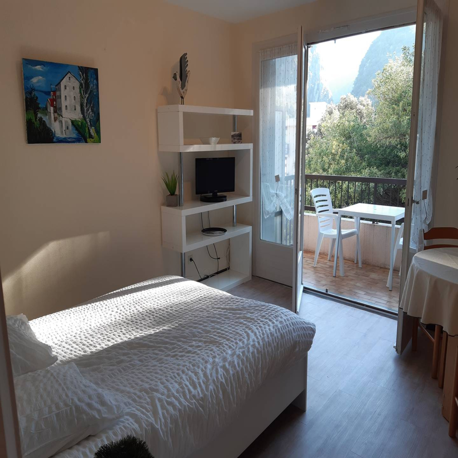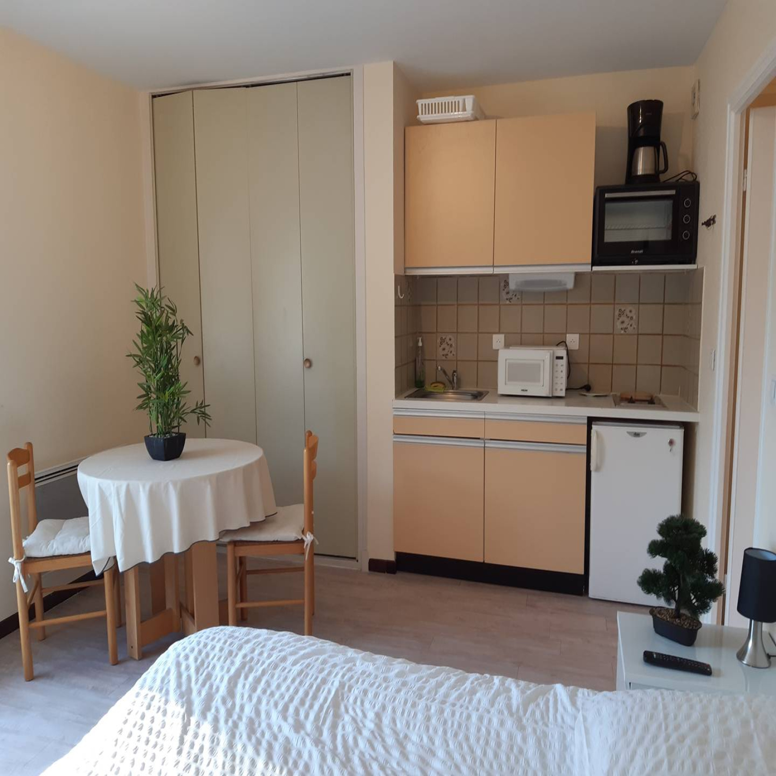 Studio d'environ 26 m² classé 2 Etoiles (décision du 09/02/2023), au 6° étage avec ascenseur, avec WIFI Collective, donnant côté Sud avec un grand balcon. Il est à proximité de l'Etablissement Thermal et du centre ville en utilisant l'ascenseur extérieur de la rue du Parc à la rue Fort les Bains. Il comprend une pièce principale avec :-Un coin cuisine avec deux plaques électriques, un four électrique, un four micro-ondes, un frigo top/bac congélateur, placards, une table avec deux chaises, un placard KZ,-Un coin repos avec un lit en 140 cm, deux tables de chevet, un meuble living, une télévision couleur, -Une salle de bain avec baignoire, meuble vasque lavabo, lave linge. WC séparés.Une grande terrasse avec 1 table, 4 fauteuils, 1 parasol. Parquet flottant au sol. Cumulus et convecteurs électriques.Relevé EDF de novembre à avril. Taxe de séjour comprise. LOCATION PREVUE POUR DEUX PERSONNES.